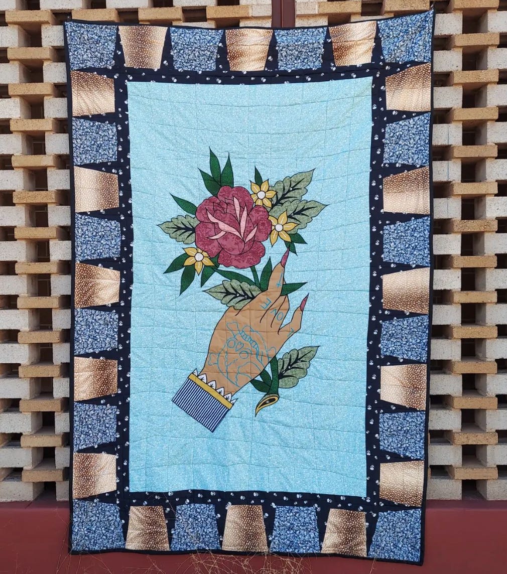The homie known as ‘The Peppermint House,’ a really innovative and masterful self-taught textile maker is looking to start a hot dog stand this summer, and having a “everything must go” sale of sorts for some of their tattoo inspired quilts, paintings, and original works of art. Lots of really awesome stuff at awesome prices!