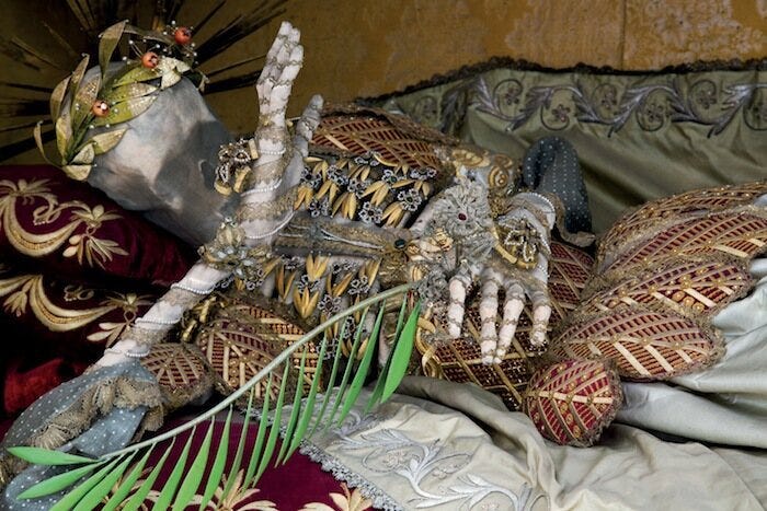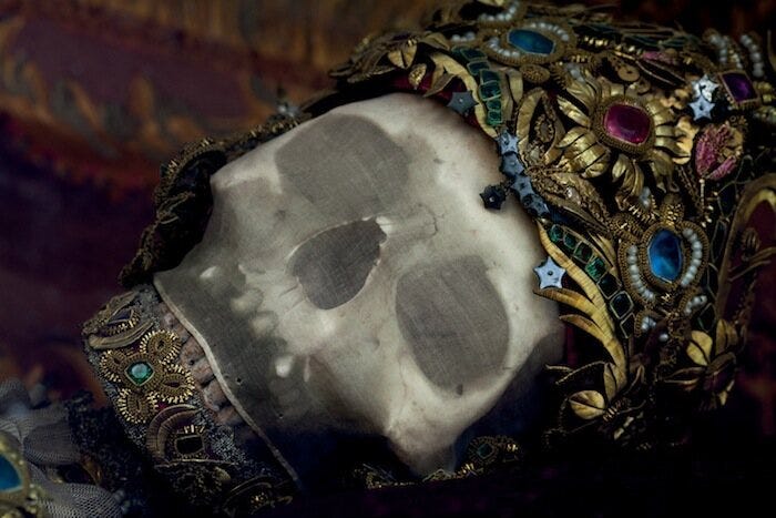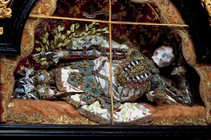 The receiving churches then spent years covering the revered skeletal strangers with jewels and golden clothing, even filling their eye sockets and sometimes adorning their teeth with finery. Yet when the Enlightenment came around they became a little embarrassing for the sheer amount of money and excess they represented, and many were hidden away or disappeared.” (Atlas Obscura)