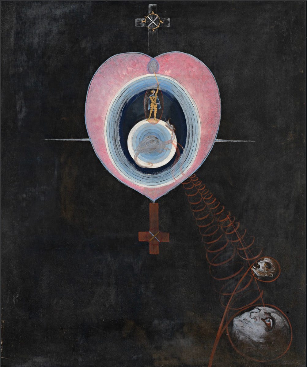 "Between 1906 and 1915, Hilma af Klint created “The Paintings for the Temple”. It comprises 193 paintings and drawings, divided into series and groups. The overall theme of the series is to convey different aspects of human evolution, instigated by polarity. “The Paintings for the Temple” also thematises different stages of development that every human being goes through during life on earth. The temple in the title refers not only to a physical building, which af Klint imagined would house the work, but also to the body as a temple for the soul." (Moderna Museet Malmö)