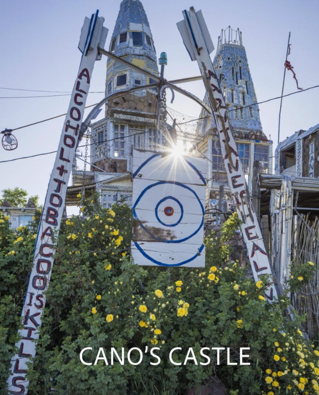Shout out to Fred Scruton for putting together this great book on Cano’s Castle, “a set of four gleaming towers, built single-handedly by Dominic “Cano” Espinoza, a Native American Vietnam vet”.