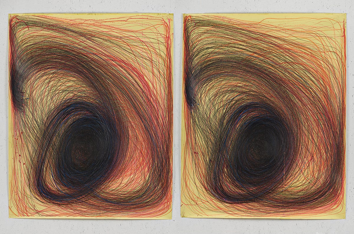 “Born in Glasgow in 1966 to Nigerian parents, Kalu lives and works in London, where she has been an artist-in-residence at ActionSpace, an organization that hosts artists with disabilities, for the past 25 years. The 59-year-old artist typically works by wrapping, coiling, and knotting pieces of fabric, rope, and even magnetic tape from VHS cassettes around a tube or other framework, achieving spirals, spools, and coils in sculptures that are both familiar and improvisational. She mirrors these gestures in her drawings, using pen, graphite, and pastels in circular motions.” (Hyperallergic)